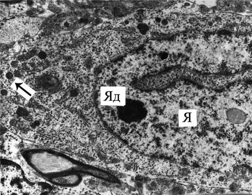 Рис. 6. Крупная нейросекреторная клетка из СОЯ. Яд - ядрышко, стрелкой обозначены нейросекреторные гранулы. Ув. 3000.