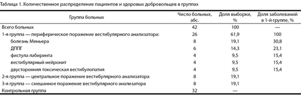 Проведено обследование 42 пациентов, страдающих верифицированными вестибулярными расстройствами различного генеза, находившихся на лечении в ЛОР-отделении, отделении неврологии и обратившихся в консультативно-диагностический центр ГКБ № 1 им. Н.И. Пирогова. Больные были разделены на три группы в зависимости от уровня поражения вестибулярного анализатора. В 1-й группе (26 (62%) больных, из них 10 мужчин, 16 женщин; средний возраст 49,3±12,5 года) был выявлен периферический тип поражения вестибулярного анализатора, обусловленный такими нозологическими формами, как болезнь Меньера, вестибулярный нейронит, доброкачественное пароксизмальное позиционное головокружение (ДППГ), перилимфатическая фистула, а также двусторонняя токсическая вестибулопатия. Во 2-й группе (8 (19%) больных, из них 2 мужчин, 6 женщин; средний возраст 66,0±6,7 года) имело место поражение центрального отдела вестибулярного анализатора, обусловленное острым нарушением мозгового кровообращения в вертебрально-базилярной системе (6 случаев) и новообразованием мозжечка (2 случая). В 3-ю группу (8 (19%) больных, из них 6 мужчин, 2 женщины, средний возраст 64,3±10,2 года) были включены пациенты со смешанной патологией вестибулярного анализатора. Помимо этого, была сформирована контрольная группа здоровых добровольцев без патологии вестибулярного анализатора (32 человека, из них 16 мужчин, 16 женщин; средний возраст 23±3,3 года). Количественный состав групп, а так же нозологий, вошедших в 1-ю группу, представлен в табл. 1.