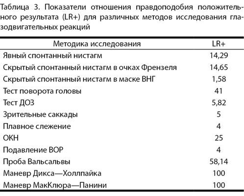 Таблица 3. Показатели отношения правдоподобия положительного результата (LR+) для различных методов исследования глазодвигательных реакций