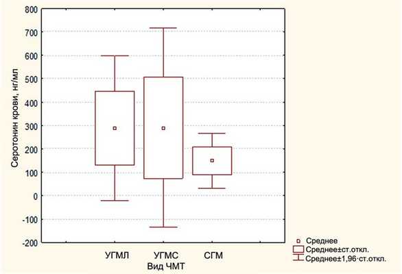 Рисунок 1. Диаграмма размаха содержания серотонина в сыворотке крови у больных с различной степенью тяжести ЧМТ. Среднее значение содержания серотонина в ликворе оказалось равным 21,4±10,7 нг/мл без значимого уровня различий между группами.