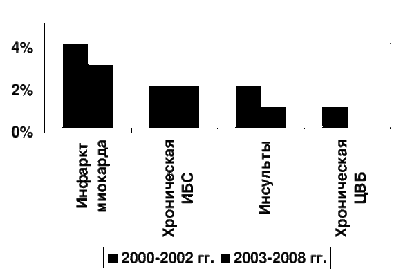 По данным вышеуказанных патологоанатомических исследований, проведенных в 2002-2008 гг. в многопрофильных скоропомощных стационарах, ЖКК разной степени тяжести, связанные с ОЭГП развивались у 67% умерших с ИБС и 55% - ЦВБ, однако их роль в танатогенезе была различной. Частота смертельных ЖКК (непосредственных причин смерти) составила при инфаркте миокарда в 2000-02 гг. 4%, в 2003-08 гг. – 3%, при хронических формах ИБС с синдромом хронической сердечной недостаточности, соответственно, 2 и 2%, при инсультах – 2 и 1%, хронических формах ЦВБ в 2000-02 гг. - 1%, а в 2003-08 гг. таких летальных исходов выявлено не было (Рис. 3).