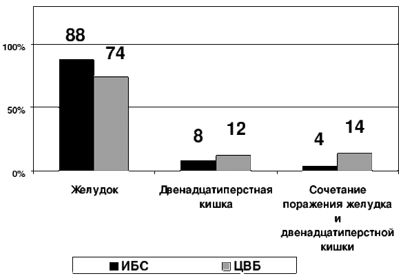 Рис.2 Частота (в %) локализации острых эрозий и язв в желудке или двенадцатиперстной кишки при ИБС и ЦВБ.