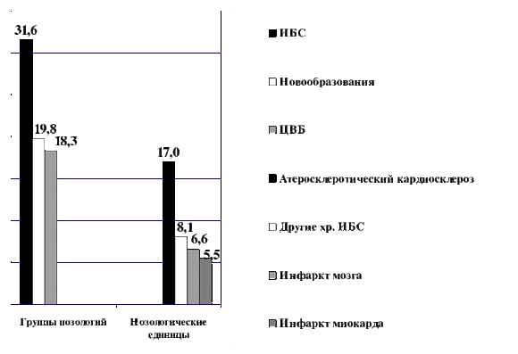 Рис.4 Самые частые (в %) заболевания и их группы (ИБС, ЦВБ, онкологические заболевания) — причины смерти в Москве в 2009 г.