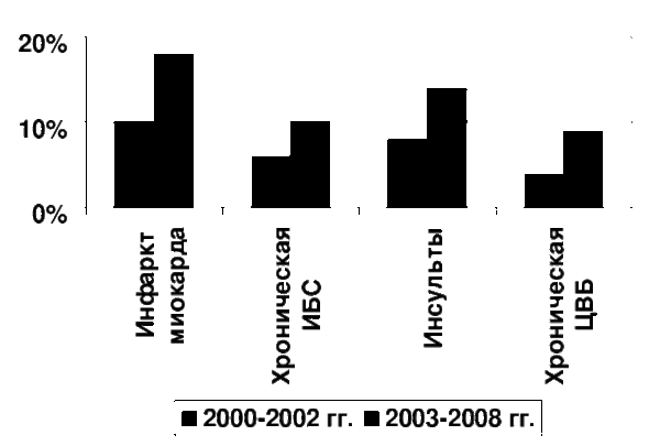 Результаты вышеуказанных исследований показали, что частота ОЭГП составила при инфаркте миокарда в 2000-2002 гг. 10%, а в 2003-2008 гг. – 18%, при хронических формах ИБС с синдромом хронической сердечной недостаточности, соответственно, 6 и 10%, при инсультах – 8 и 14% и при хронических формах ЦВБ – 4 и 9% (Рис. 1). В наблюдениях с сочетанием заболеваний из групп ИБС и ЦВБ ОГЭП обнаруживались значительно чаще, в 21% наблюдений. Рост частоты ОЭГП в 2003-2008 гг. в определенной мере можно объяснить включением в анализируемую группу (по сравнению с 2000-2002 гг.) больных с сахарным диабетом, которые составили 22,7% при ИБС и 10,8% - при ЦВБ [2-8, 10, 11].