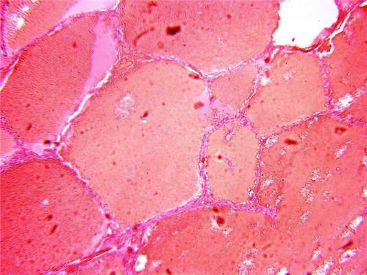 Минимальный экзофтальм и легкое затуманивание зрения у женщины средних лет. Та же пациентка, что и на рисунке выше, на Т1-взвешенной МР-томограмме отмечается крупное объемное образование внутри мышечного конуса. На Т1-взвешенной МР-томограмме с гадолиниевым усилением отмечается резкое усиление контрастна образования. На Т2-взвешенных МР-томограммах образование дает яркий сигнал, сравнимый с сигналом от стекловидного тела. Верхнелатеральная орбитотомия через разрез складки века, удаление сосудистого образования. При гистологическом исследовании определяются выстланные эндотелием крупные сосудистые лакуны, разделенные соединительной тканью, что соответствует картине кавернозной гемангиомы (гематоксилин-эозин, х50).