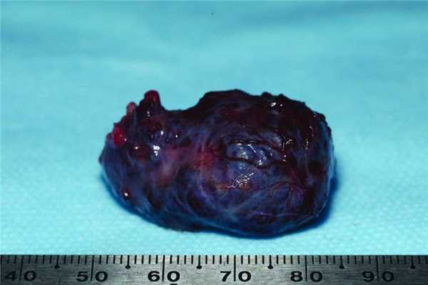 Учитывая клинические данные и результаты обследования дополнительными лучевыми методами, предположили наличие КГ и приняли решение об оперативном лечении. Была выполнена вертикальная транспальпебральная передняя орбитотомия по Смиту (vertical lid split). После тщательной диссекции новообразования и коагуляции питающих сосудов en bloc был удален узел (35×21×20 мм) буро-красного цвета с мелкобугристой поверхностью, на котором выделялись магистральные сосуды, ответвления магистрального типа и разветвленная сеть поверхностных сосудов (рис. 6). Рисунок 6. Рис. 6. Макроскопический вид опухоли сразу после удаления. На нижней поверхности образования имелось желобообразное вдавление - место контакта со зрительным нервом. После удаления опухоли верхнее веко было послойно ушито.