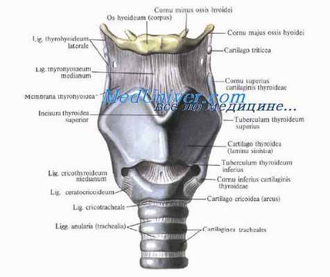 Верхней границей гортани является отверстие, которое получило название входа в гортань. Снизу гортань плавно переходит в трахею - дыхательную трубку. По бокам от нее находятся доли щитовидной железы, а также сосуды и нервы шеи.