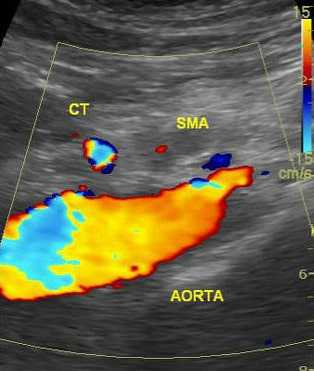 Если пик скорости кровотока в систолу натощак превышает 275 см/сек, то соответствующая артерия стенозирована на 70% или более. В таких случаях чувствительность составляет 89%, а специфичность — 92%. До сих пор врачи не пришли к однозначному заключению, следует ли определять скорость кровотока после приема пищи у больных, если у них во время исследования натощак уже получены данные, говорящие об окклюзии (> 275 см/сек).