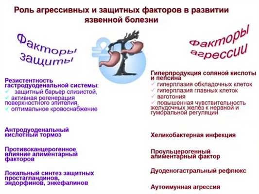 В механизме развития (патогенезе) язвы желудка и язвы двенадцатиперстной кишки (ДПК) ведущую роль занимает комплекс расстройств, приводящих к нарушению равновесия между агрессивными факторами желудочной среды и защитными механизмами слизистой оболочки желудка и двенадцатиперстной кишки.