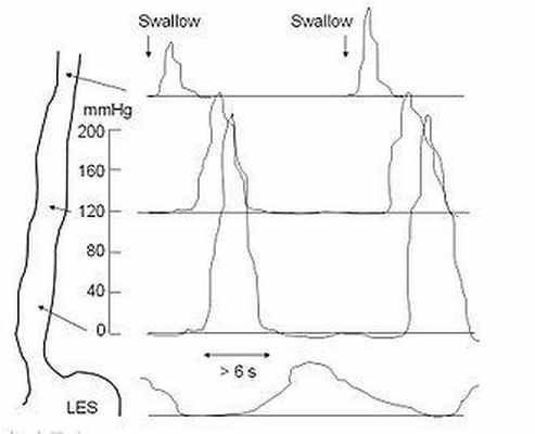 - спастические сокращения стенок пищевода в виде волн различной формы и амплитуды, во время которых давление в пищеводе превышает 30 мм.рт.ст.;