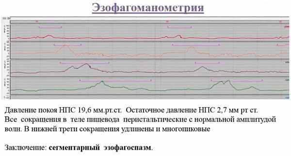 При проведении манометрии пищевода обнаруживаются спастические сокращения стенок пищевода в виде волн различной формы и амплитуды, эпизоды нормальной перистальтики, рефлекторное расслабление нижнего пищеводного сфинктера, неполная его релаксация.