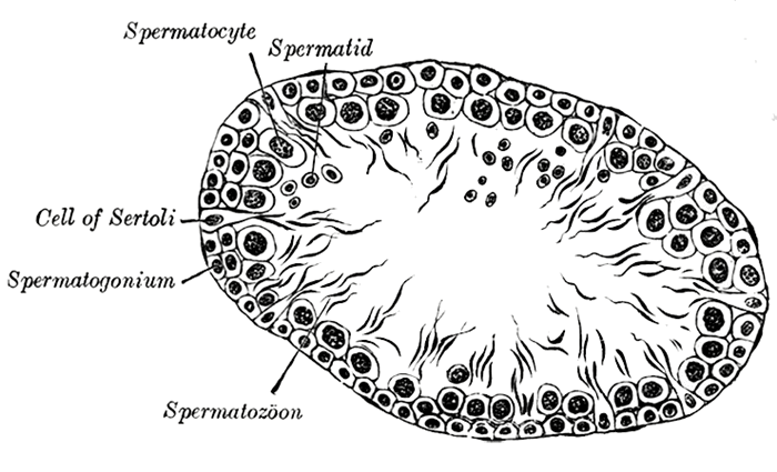 Сперматозоиды образуются в яичках, а именно в извитых семенных канальцах. Стенка семенного канальца делится базальной мембраной на люминальную и адлюминальную стороны. На люминальной стороне расположены клетки Сертоли (сустентоциты) и предшественники половых клеток (сперматогонии, сперматоциты I и II порядков и сперматиды).