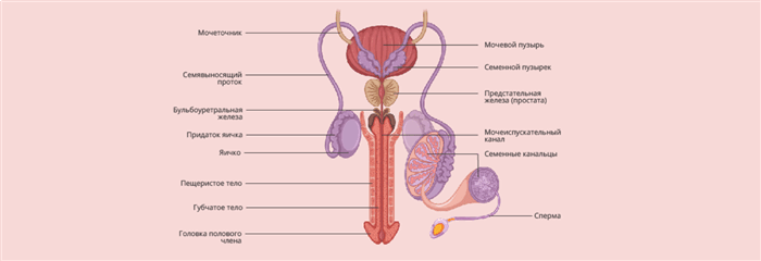 - Половой член , или пенис — орган, предназначенный для полового акта и извержения спермы во влагалище женщины. Он состоит из трех частей: корня (при помощи него пенис прикрепляется к лобковой области), тела и головки, прикрытой складкой кожи – крайней плотью. В области крайней плоти находится много желез, которые вырабатывают сальную смазку — смегму . Внутри половой член состоит из трех частей (их называют телами). Два пещеристых (кавернозных) тела находятся сверху. Именно они, заполняясь кровью, обеспечивают эрекцию. Внизу находится губчатое (спонгиозное) тело — в нем проходит мочеиспускательный канал. Во время полового акта, когда из пениса извергается сперма, путь для мочи перекрывается.