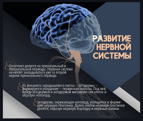 Онтогенез делится на пренатальный и постнатальный периоды. Нервная система начинает закладываться уже со второй недели пренатального периода. Из внешнего зародышевого листка – эктодермы – формируется утолщение – первичная полоска. Под ней, между эктодермой и энтодермой мигрирует тяж клеток и образует нотохорд, который служит временным скелетом для зародыша. Эктодерма, окружающая нотохорд, утолщается и формирует нервную пластинку. Далее, клетки нервной пластинки делятся, образуя нервную бороздку и нервные валики. Со временем валики смыкаются над бороздкой, образуя нервную трубку – это процесс нейруляции.