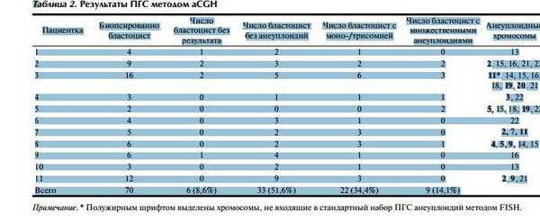Таблица 1. Качество бластоцист и качество генетического набора хромосом