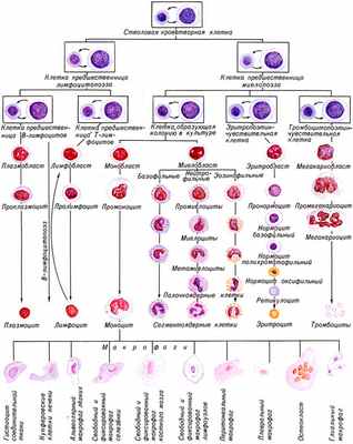 Общей родоначальной клеткой всех клеток крови является полипотентная стволовая клетка крови, которая способна к дифференцировке и может дать начало роста любым форменным элементам крови и способна к длительному самоподдержанию. Каждая стволовая кроветворная клетка при своем делении превращается в две дочерние клетки, одна из которых включается в процесс пролиферации, а вторая идет на продолжение класса полипотентных клеток. Дифференцировка стволовой кроветворной клетки происходит под влиянием гуморальных факторов. В результате развития и дифференцировки разные клетки приобретают морфологические и функциональные особенности.