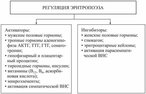 Регуляция эритропоэза осуществляется эритропоэтинами, образующимися в почках. Эритропоэз стимулируется мужскими половыми гормонами, тироксином и катехоламинами. Для образования эритроцитов нужны витамин В12 и фолиевая кислота, а также внутренний фактор кроветворения, который образуется в слизистой оболочке желудка, железо, медь, кобальт, витамины. В нормальных условиях продуцируется небольшое количество эритропоэтина, который достигает клеток красного мозга и взаимодействует с рецепторами эритропоэтина, в результате чего изменяется концентрация в клетке цАМФ, что повышает синтез гемоглобина. Стимуляция эритропоэза осуществляется также под влиянием таких неспецифических факторов, как АКТГ, глюкокортикоиды, катехоламины, андрогены, а также при активации симпатической нервной системы.