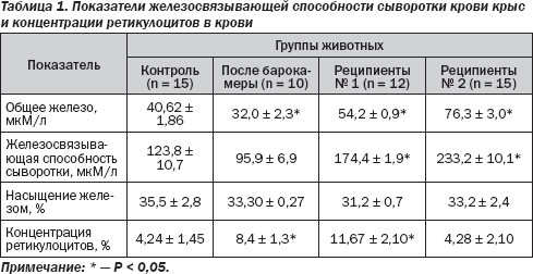Для этого нами использован многоступенчатый эксперимент. Сначала животных (крысы линии Вистар) на 18 часов помещали в барокамеру при пониженном содержании кислорода (аналог высоты 4000 м над уровнем моря). Это широко используемая модель стимуляции образования эритропоэтина. После этого крыс забивали кровопотерей, а сыворотку крови (по 2 мл) вводили реципиентам (№ 1). Спустя сутки, когда из их крови эритропоэтин уже исчезал [7], у этих животных также забирали кровь, а сыворотку вводили (по 2 мл) следующим реципиентам (№ 2). Спустя сутки кровь данных реципиентов исследовалась на содержание железа. В каждой серии также исследовалась концентрация железа у контрольных крыс (им вводился физиологический раствор).