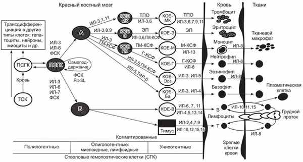 Современные представления о гемопоэзе, включающие пути дифференциации полипотентных стволовых гемопоэтических клеток, важнейшие цитокины и гормоны, регулирующие процессы самообновления, пролиферации и дифференциации полипотентных стволовых клеток в зрелые клетки крови представлены на рис. 1.