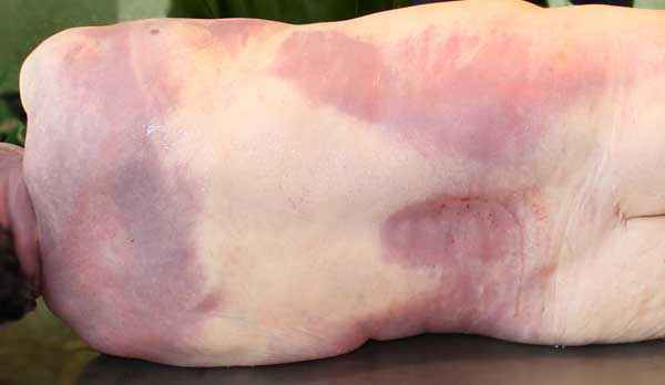 Кровоизлияния в области трупных пятен нередко наблюдаются при смерти от отравления алкоголем, механической асфиксии, электротравме, при некоторых видах скоропостижной смерти.