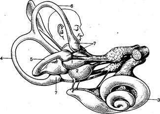 1 — эллиптический и 2 — сферический мешочки преддверия; 3 — улитка; 4 — задний, 5 — наружный и 6 — верхний полукружные каналы; 7 — ампулы полукружных каналов.