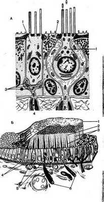 А — структура и расположение волосковых клеток: 1 — волосковые клетки; 2 — опорная клетка; 3 — нервные окончания; 4 — нервное волокно; Б — схема строения отолитового аппарата: 1 — отолиты; 2,— отолитовая мембрана; 3 — волоски; 4 — опорные клетки; 5 — волосковые клетки; 6 — нервные волокна"