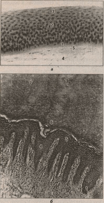Рис. Схема строения базальной мембраны (на примере эпидермиса) по данным световой микроскопии (а), электронной микроскопии и биохимических исследований (б) (по В.Е. Соколову и соавт.):