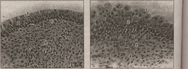Эпителий состоит из базального, шиповатого слоев и слоя плоских клеток (рис.). Базальные клетки цилиндрической формы. Они прикреплены к базальной мембране полудесмосомами. Среди базальных клеток есть стволовые клетки, за счет митотического деления которых происходит регенерация эпителия на клеточном уровне. При травме митозы могут появляться в шиповатом слое. Эти два слоя объединены в ростковый слой Мальпиги. В шиповатом слое клетки многоугольные, с отростками ("шинами"), в области которых соседние клетки связаны друг с другом десмосомами. В клетках имеются диффузно лежащие кератиновые тонофиламенты. В слое плоских клеток клетки плоские, они постепенно отмирают и слушиваются с поверхности, замещаясь новыми клетками, мигрирующими из глубжележащих слоев. Функций этого эпителия — разграничительная, барьерно-защитная, всасывательная, экскреторная.