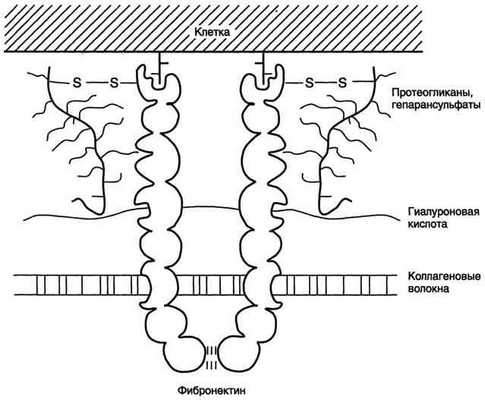 Фибронектин - один из ключевых белков межклеточного матрикса, неколлагеновый структурный гликопротеин, синтезируемый и выделяемый в межклеточное пространство многими клетками. Он построен из двух идентичных полипептидных цепей, соединённых дисульфидными мостиками у своих С-концов (рис. 15-19). Полипептидная цепь фибронектина содержит 7-8 доменов, на каждом из которых расположены специфические центры для связывания разных веществ. Фибронектин может связывать