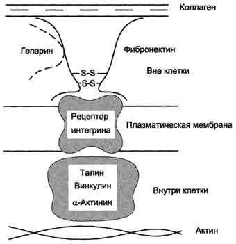 (RGD), с помощью которой он может присоединяться к клеточным рецепторам (интегринам). Эти рецепторы опосредованно взаимодействуют с актиновыми микрофиламентами, которые находятся в цитозоле. В этом процессе участвуют так называемые белки прикрепления: талин, винкулин, α-актинин. С помощью таких белок-белковых взаимодействий информация может передаваться из межклеточного матрикса внутрь клетки, а также в обратном. Фибронектин участвует в миграции клеток.