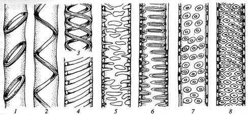 Сосуды и трахеиды передают растворы не только в продольном, но и в поперечном направлении в соседние трахеальные элементы и в живые клетки. Боковые стенки трахеид и сосудов сохраняются тонкими на большей или меньшей площади. Но в то же время они обладают различного рода утолщениями, придающими стенкам прочность. В зависимости от характера боковых стенок трахеальные элементы называются кольчатыми, спиральными, сетчатыми, лестничными и точечно-поровыми.