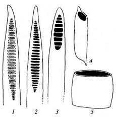 1 - лестничная поровость трахеиды (перфорации отсутствуют); 2,3- лестничные перфорации; 4, 5- простые перфорации