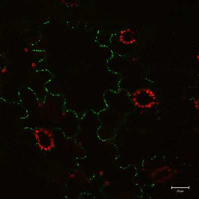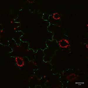 Транспортный белок вируса табачной мозаики, маркированный зелёным флуоресцентным белком, в плазмодесмах клеток листа Nicotiana benthamiana (конфокальная микроскопия).