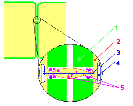 4. Система связанных друг с другом клеточных стенок (апопласт) служит главным путем, по которому передвигаются вода и растворенные в ней питательные вещества. Клеточные стенки скреплены между собой с помощью срединных пластинок. В стенках имеются небольшие поры, сквозь которые проходят цитоплазматические тяжи, называемые плазмодесмами. Плазмодесмы связывают живое содержимое отдельных клеток, т. е. объединяют все протопласты в единую систему, в так называемый симпласт.