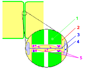 Плазмодесмы — Схематическая структура плазмодесмы. 1 клеточная стенка 2 плазмолемма 3 десмотубула 4 эндоплазматический ретикулум 5 белки плазмодесмы Плазмодесмы (от греч … Википедия