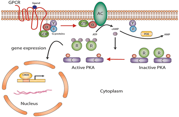 В неактивном состоянии молекула протеинкиназы А является является тетрамером — состоит из двух регуляторных ( R ) и двух каталитических субъединиц. Если уровень цАМФ в клетке низкий, то фермент остается интактным, и каталитическая активность отсутствует. При возрастании концентрации цАМФ в клетке он связывается с двумя сайтами связывания на регуляторных субъединицах протеинкиназы А, в результате происходят конформационные изменения фермента, в результате которых тетрамер протеинкиназы А диссоциирует на два димера (2 R и 2С). Открытые активные центры каталитических субъединиц переносят концевой фосфат молекулы АТФ на остатки серина или треонина белков - субстратов протеинкиназы А.