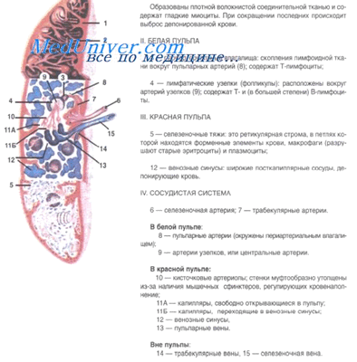 Лимфатическое периартериальное влагалище окружает артерию после выхода ее из трабекулы. В его составе обнаруживаются антигенпредставляющие (дендритные) клетки, ретикулярные клетки, лимфоциты (преимущественно Т-хелперы), макрофаги, плазматические клетки. Лимфатические первичные узелки по своему строению аналогичны таковым в лимфатических узлах. Это округлое образование в виде скопления малых В-лимфоцитов, прошедших антигеннезависимую дифференцировку в костном мозге, которые находятся во взаимодействии с ретикулярными и дендритными клетками.