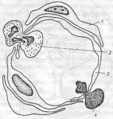 Сегментоядерный нейтрофил и ретикулоцит пересекают стенку синуса. I — адвентициальная клетка, 2 - нейтрофил, 3 — эндотелиальная клетка, 4 — ретикулоцит.