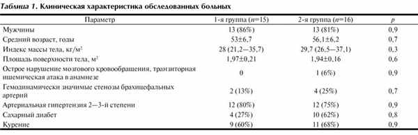 Коронарная недостаточность по данным «стресс»-ЭхоКГ выявлена у 36 пациентов. Клинических различий между пациентами 1-й и 2-й групп не было (табл. 1). Согласно представленным данным, больные не имели статистически значимых различий по полу, возрасту и сопутствующей патологии (ожирение, сахарный диабет). Особо следует подчеркнуть, что не было различий между группами по эхокардиографическим показателям. Так, индекс конечного диастолического объема ЛЖ в 1-й и 2-й группах составил 56±3,7 и 59±6,1 мл/м 2 соответственно (р=0,41). Фракция выброса ЛЖ в обеих группах соответствовала нормальным значениям, а индексы нарушения локальной сократимости миокарда были равны 1.