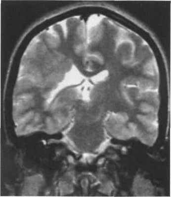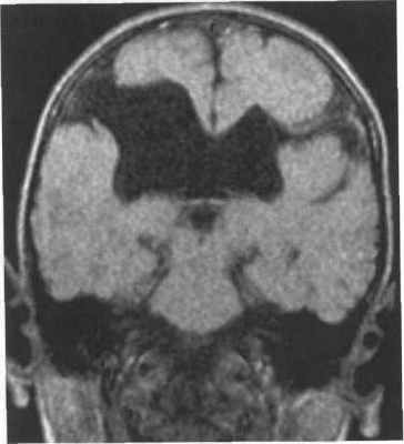 Рис. 3.23. Открытая шизэнцефалия правой лобной доли. МРТ.