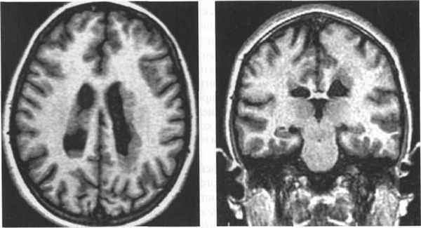 (б) Коронарный срез: в этом же случае имеется расширение желудочков преимущественно спереди.