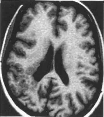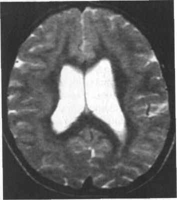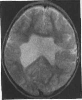 б - IR ИП, аксиальная плоскость. Толщина коры увеличена, желудочки мозга расширены.