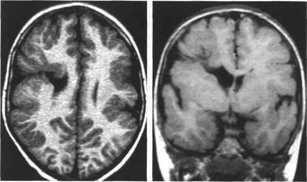 Рис. 3.22. Двусторонняя открытая шизэнцефалия. МРТ.