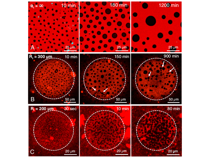Чтобы изучить динамические свойства образовавшейся структуры, авторы работы проанализировали изменения, которые происходят в пленке с течением времени или при изменении температуры. Оказалось, что повышение температуры от комнатной до температуры тела не приводит к структурным изменениям на поверхностях любой кривизны. При этом «старение» пленок с течением времени проходит на разных поверхностях по-разному. Так, на плоской поверхности структура полностью сохраняется, а на сферических поверхностях со временем происходит образование более анизотропных доменов за счет слияния нескольких круглых.