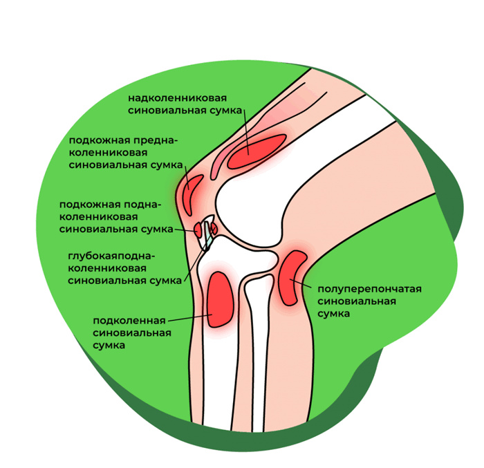 Бурсит – воспаление околосуставной сумки (бурсы) , в которой содержится суставная жидкость. Симптомы бурсита – покраснение, припухлость, боль над коленной чашечкой. В области коленного сустава расположено несколько синовиальных сумок.