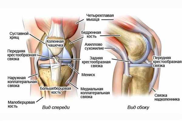Коленный сустав является сочленением трех костей: бедренной, большеберцовой и надколенника (коленной чашечки). Он укреплен связочным аппаратом: передней и задней крестообразными, коллатеральными связками, суставной капсулой. Спереди проходит собственная связка надколенника, переходящая в сухожилие четырехглавой мышцы бедра.