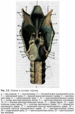 Суставы. Боковые поверхности перстневидного хряща соединены со щитовидным хрящом при помощи парного перстнещитовидного сустава (articulatio cricothyreoidea). Оба сустава функционируют одновременно; при сокращении мышц верхний отдел щитовидного хряща наклоняется вперед либо назад, тем самым изменяя расстояние между щитовидным и черпаловидными хрящами, при этом увеличивается или ослабевает натяжение голосовых складок, повышается или понижается высота голоса.