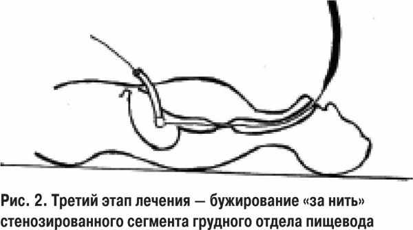 На третьем этапе (через 2 нед после операции) приступали к бужированию по методике «за нить» дистального стеноза (рис. 2). Такой подход оказался эффективным у 4 больных со стенозами двойной локализации.