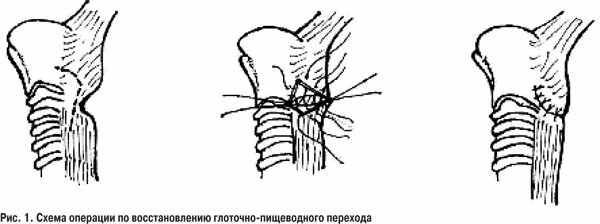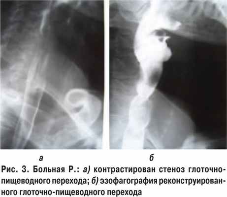 Приводим клинический пример. Больная Р., 46 лет, поступила в клинику 22.12.2003 г. Ожог глотки и пищевода муравьиной кислотой в мае 2003 г., суицидальные действия. В июне 2003 г. была наложена гастростома в другой клинике. При поступлении пациентка отмечала выраженную дисфагию, с трудом глотала жидкость. Выполнена эзофагография с водорастворимым контрастом (рис. 3а). Выявлен рубцовый стеноз двойной локализации: на уровне глоточно-пищеводного перехода и в среднегрудном отделе на протяжении 14 см. При эндоскопическом исследовании диагностирована рубцовая деформация гортаноглотки и облитерация левого грушевидного синуса. Попытка бужирования была безуспешна из-за ригидного стеноза глотки. 17.02.2004 г. выполнена операция: левосторонняя цервикотомия, продольное рассечение гортаноглотки и глоточно-пищеводного перехода на протяжении 4 см, иссечение рубцово-измененных участков слизистой оболочки глотки и начального отдела пищевода, формирование анастомоза в ¾ окружности в поперечном направлении между рото-, гортаноглоткой и пищеводом. Послеоперационный период протекал без осложнений (рис. 3б).
