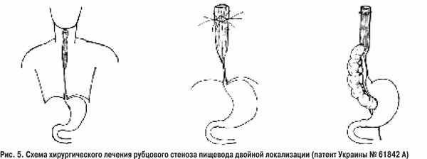 Таким образом при рубцовом стенозе пищевода двойной локализации, когда один из стенозов короткий и не поддается расширению, возможны следующие органосохраняющие варианты лечения: